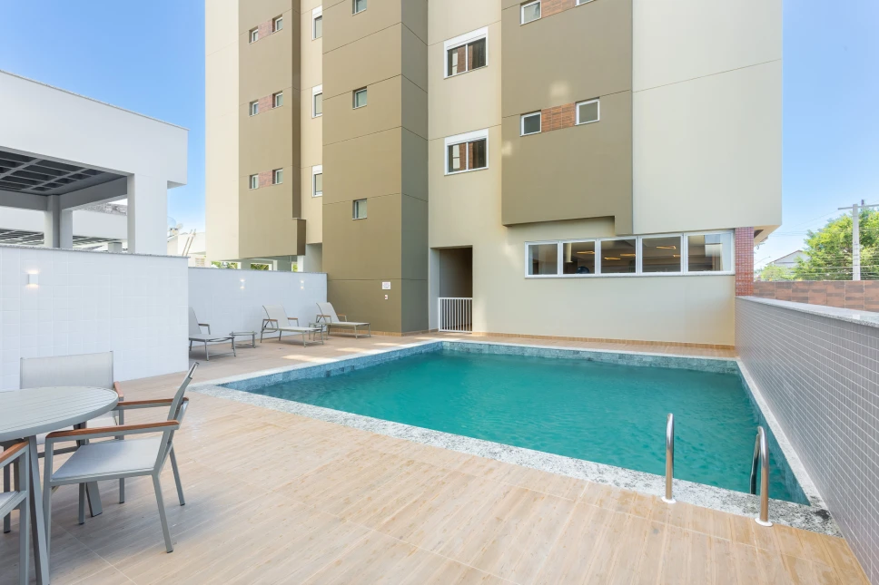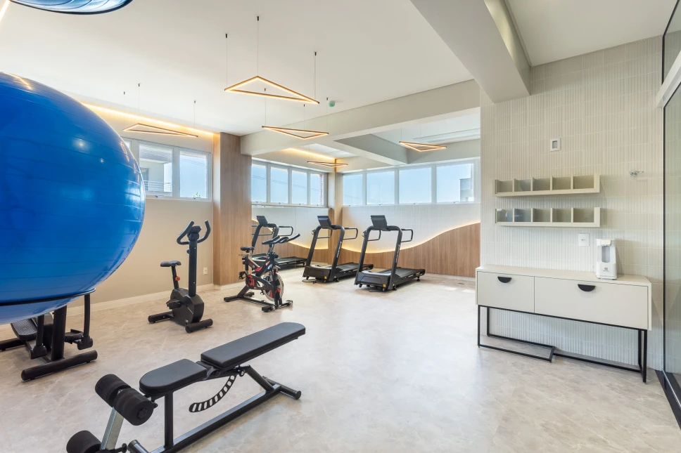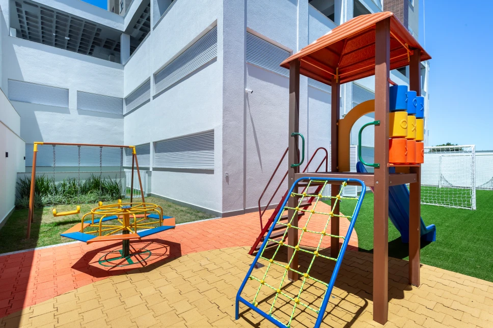 02 ou 03 dormitórios de acordo com o apartamento desejado (sendo 1 suíte), academia, churrasqueira, espaço pet, piscina, playground, sacada, salão de festas, 02 Elevadores, salas comerciais, sistema de segurança por câmera 24h, minicampo de Futebol.