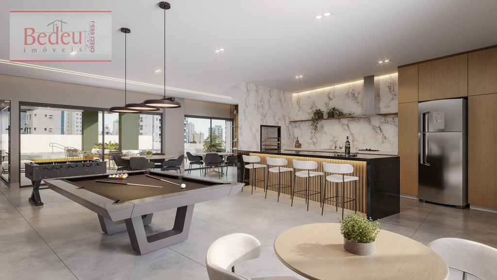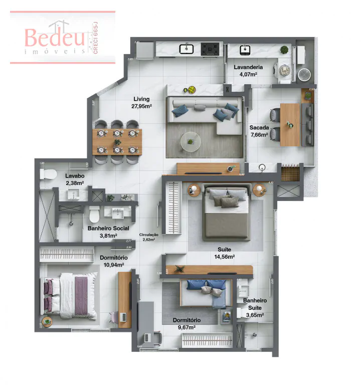 Apartamento com 3 dormitórios, sendo 1 suíte, banheiro social, lavabo, sala de jantar/estar, cozinha, área de serviço e sacada com churrasqueira à carvão.