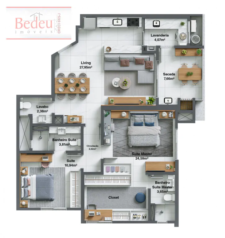 Apartamento com 3 dormitórios, sendo 1 suíte, banheiro social, lavabo, sala de jantar/estar, cozinha, área de serviço e sacada com churrasqueira à carvão.